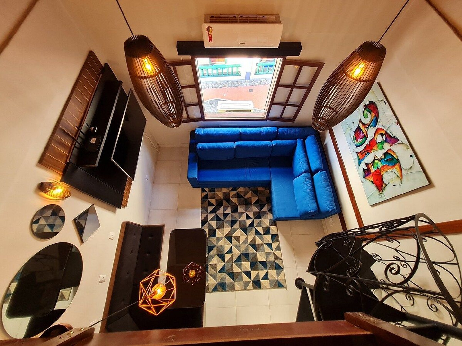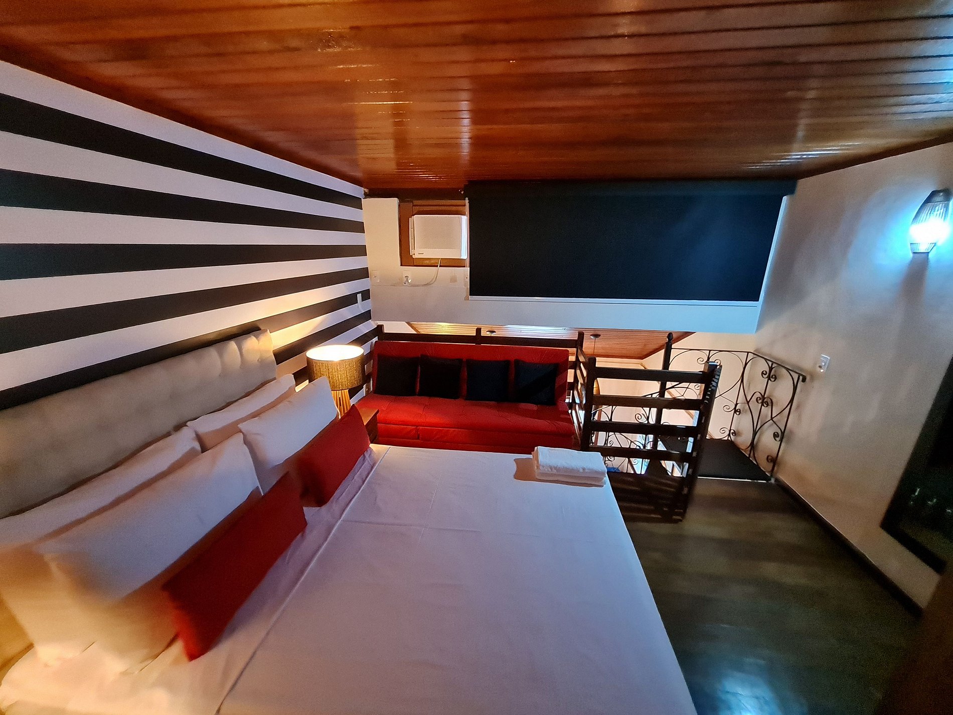 HABITACIÓN MESANINE - una cama doble, una litera, lámpara, mesita de noche, aire acondicionado, TV de 32 pulgadas, iluminación climática, cortinas blackout, sofá cama individual y con opción de bascular para ver la TV, edredones, mantas, almohadas, nevera , más fresco y seguro con contraseña.