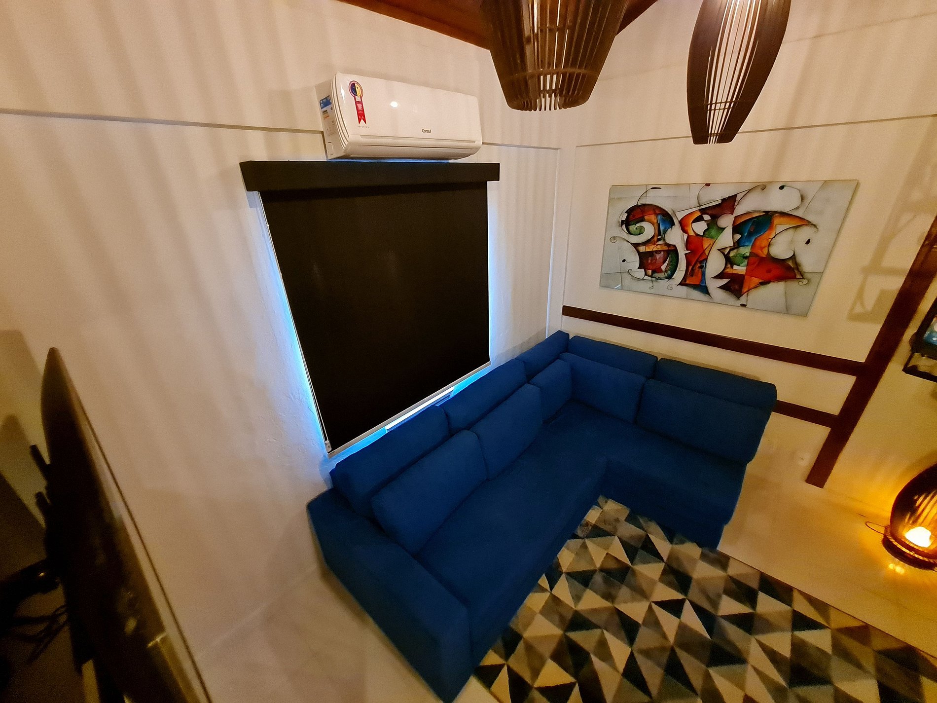 AMBIENTE 1 - SALA DE ESTAR - Ofrecemos a nuestros huéspedes: Sofá cama de hasta 2 plazas, TV de 50 pulgadas, aire acondicionado, persianas con blackout, mesa de rincón de 4 plazas, iluminación climática.