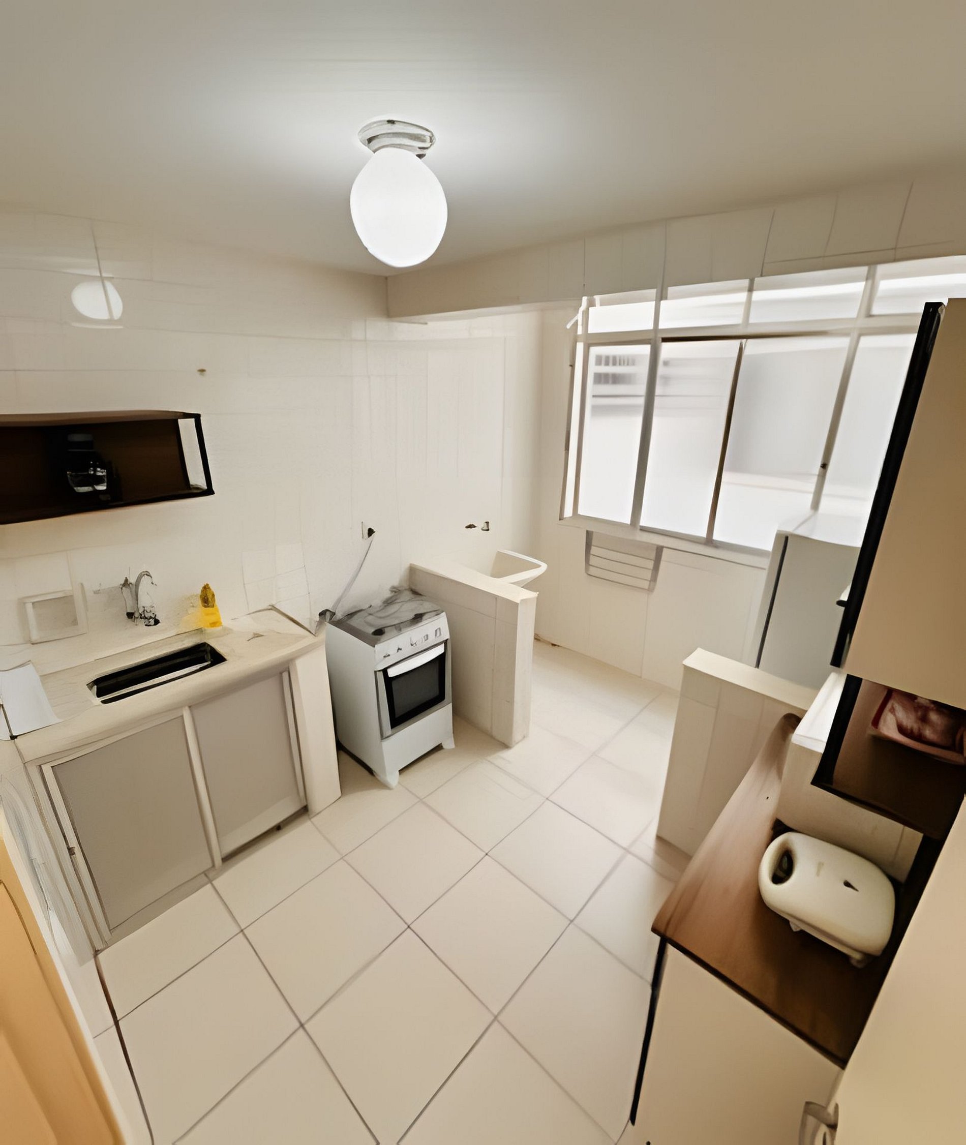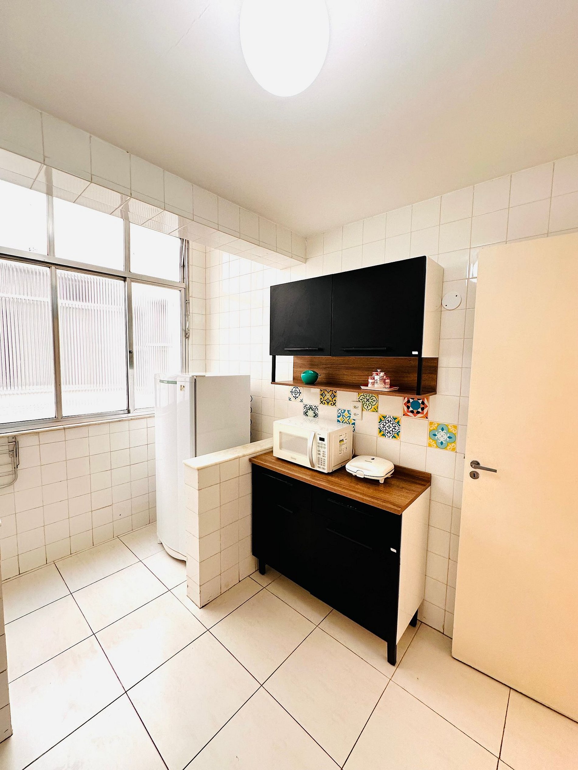 - Utensílios de cozinha como copos, pratos, panelas e talheres - Cafeteira, sanduicheira, microondas, chaleira elétrica de água, geladeira, armário, forno e fogão - Pia e Tanque, janelas com ambiente arejado.